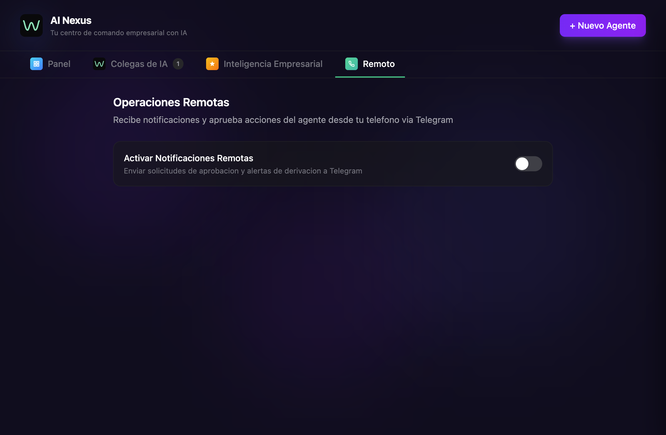 Abre WhatsApp AI Pro, ve a Configuración, busca Integración Telegram. Escanea un código QR con tu app de Telegram. Elige sobre qué quieres ser notificado — todo, solo traspasos, o solo leads de alta prioridad.